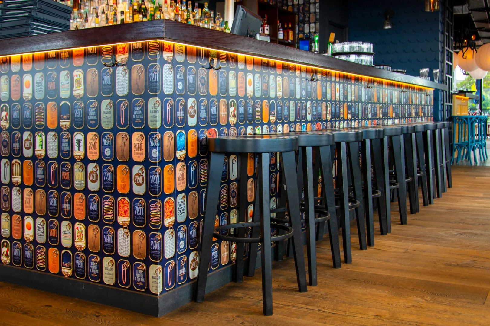 A large colourful and bright caged neon sign was required for a street exterior look. Our industrial designers developed a unique system allowing the neon to be swapped with ease while it remained in the cage, and on a clear background. The brief for Sardine bar was for a sign that emulated a sardine can. We created an opal acrylic face which illuminates and completed it with acrylic lettering in a gold frame.